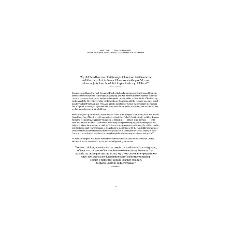 Verkent de intieme band tussen kleding en herinnering door de ogen van drie artiesten die verbonden zijn door de tactiele en emotionele intensiteit van hun werk: kunstenares LOUISE BOURGEOIS , ontwerpster SIMONE ROCHA, en choreografe ANNE TERESA DE KEERSMAEKER.